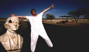 (After risking life, limb, and reputation by hanging out of the van door as we cruise through an intersection, in a successful effort to snag a Caravan member's sunglasses, which turn out to be official Pabst Blue Ribbon sunglasses, estimated value probably in the neighborhood of 89 cents. AZ governor Fife Symington must have felt similar when, as a student, he saved from drowning a fellow student by the name of Bill Clinton.)