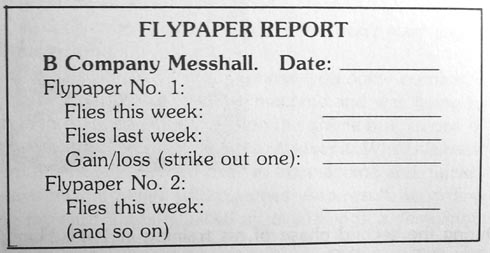 One August afternoon Lieutenant Troy was inspecting one of the messhalls. Though the summer was well along, window screens had not been issued. So the mess sergeants, to keep the flies down, had hung up half a dozen of those sticky flypaper spirals. Troy saw them and the trigger tripped.