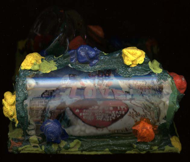 Last weekend we were at Salvation Mountain. I gave Leonard a copy of an interview we had done on my previous visit. He liked how it came out, so he gave me this pen holder he made from bottles, window putty, paint, and a Salvation Mountain postcard.
