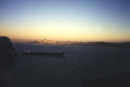 A representative of our benevolent petroleum industry nearly ruins a beautiful Golden Gate sunset moment.