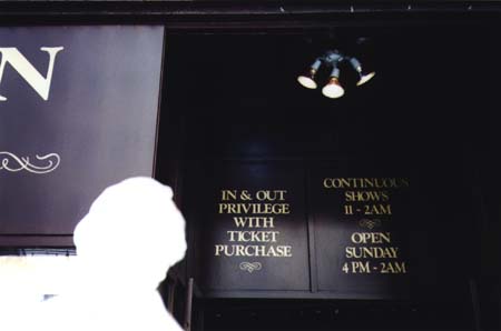 This was a nudie bar across the way called "Chez Paree." We argued over whether the sign meant you get free drive-in burgers with admission, but we'll never know because W made the camera-shy bouncer nervous. And I didn't even get to ask what in the world's a "wall dance." ("Shadow puppets," W assures me.)