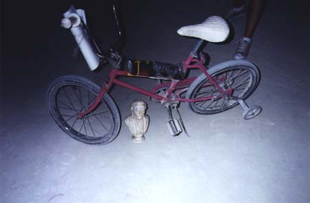 The bike itself was a $3.33 thrift store refugee that a couple of Detroitsters snagged (3 bikes/ten bucks) and hauled up to the playa. The light's just one of those flourescent stick jobbies, with blinking side lights and a light on the end. But when ya put 'em on a bike, see...well, ya gotta whole nother deal goin there, yup. Couldn't have been designed more perfectly if the bike makers had made it standard equipment: you got your headlight, you got your blinking emergencies, and you got your all-important Playa Illumination. (But I'm getting ahead of the story...)