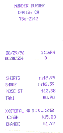 Okay, so I haven't got the photo developed yet. Sue me. But first: imagine the logo from the MURDER BURGER sign on the front of a black t-shirt, and on the back, three blood-oozin' bullet holes. There...you're feeling a little less litigious now, aren't you?
