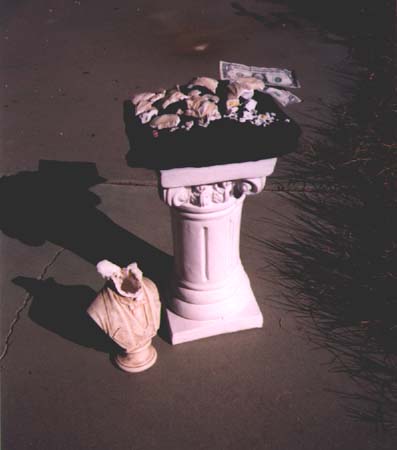 Still inside W were (1) a peppermint (left inside W last year by party/parties unknown) and (2) the $2 deposited by Pat into the (former) hole in W's head, just before this year's Burning Man. |